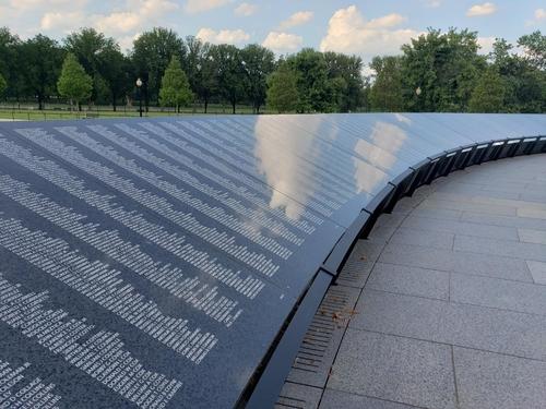 ‘ROBERT E DIXON, CURTIS L DALE, BOBBY G COVER, YEONG-JUN DO…’ 깨알 같은 글씨로 빼곡히 새겨진 이름들. 잊혔던 그날의 영웅들. 20일 워싱턴DC 한복판 내셔널 몰에 위치한 한국전쟁 기념공원. 작년 3월 16일부터 공사에 들어가 먼지가 날렸던 이곳이 마침내 16개월여 만에 새 단장을 마치고 숭고한 모습을 드러내고 있었다. 기념공원의 중앙에 새 조형물이 들어선 것이다. 이름하여‘추모의 벽’(Wall of Remembrance). 높이 1m, 둘레 50m의 단단한 짙은 회색의 화강암 벽이 기존에 있던 연못 ‘기억의 못’을 둥글게 에워쌌다.