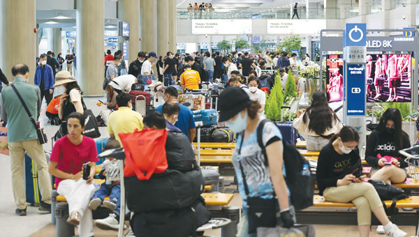 1일부터 해외 입국자의 한국 입국 요건이 완화되면서 인천국제공항을 통한 해외입국자가 급증하고 있다. 2일 인천국제공항 제1여객터미널 입국장이 입국자들로 붐비고 있다. [연합]