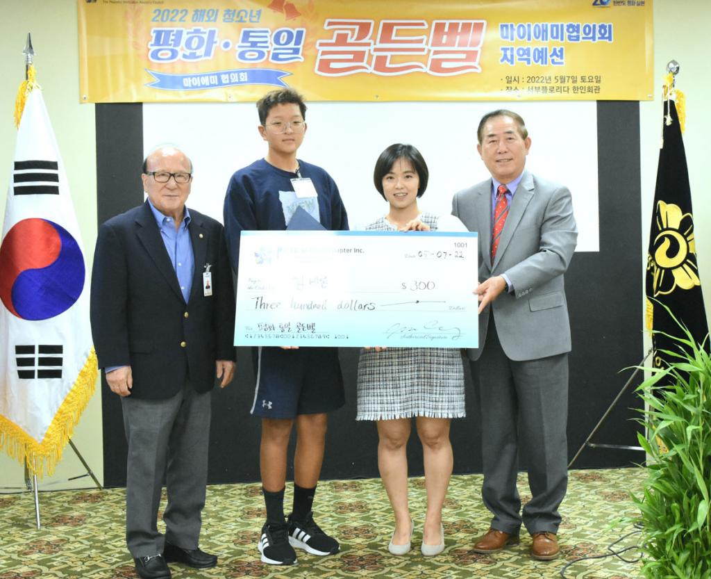 7일 마이애미 평통 평화통일 골든벨대회에서 최우수상을 차지한 김바론(왼쪽 두번째) 학생에게 평통 임원들이 상금을 전달하고 있다. 사진 왼쪽부터 노흥우 수석부회장, 김바론, 강지니 회장 대행, 장익군 상임위원.