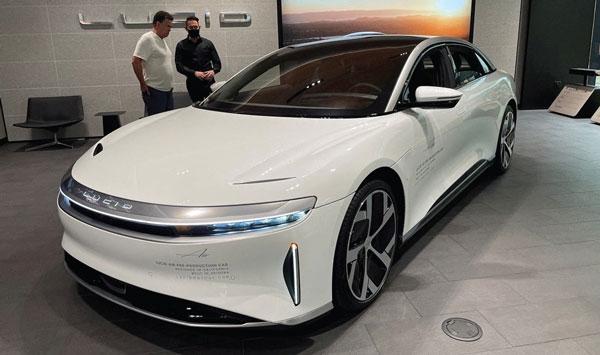 애리조나주 스캇츠데일의 한 전시장에 진열된 루시드 에어 전기차를 고객들이 살펴보고 있다. [로이터]