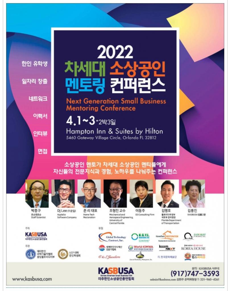 미주한인소상공인총연합회(KASBUSA, 회장 장마리아, 이사장 김영출)가 2022 차세대 소상공인 멘토링 컨퍼런스를 오는 4월1일부터 3일까지 2박 3일 일정으로 올랜도 햄튼 인(Hampton Inn & Suites by Hiltons)에서 개최한다.