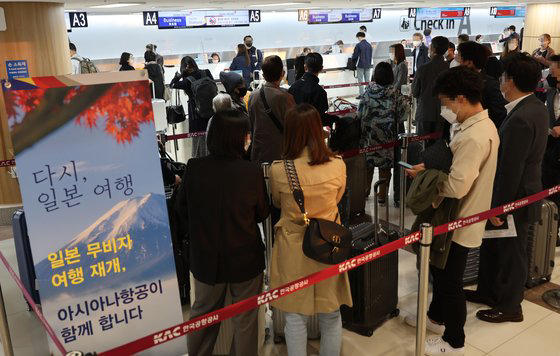 코로나19 확산으로 중단됐던 한국인의 무비자(사증 면제) 일본 관광이 재개된 지난 10월 11일 오전 김포국제공항 아시아나항공 국제선 카운터에서 탑승객들이 김포~하네다 항공편 탑승수속을 위해 기다리고 있다. 연합뉴스