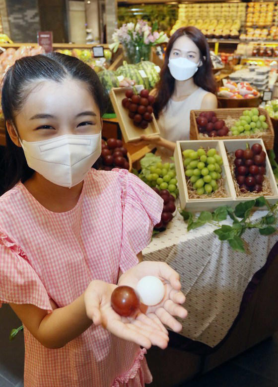 국내 백화점에 납품된 루비로망. 적색 포도가 루비로망이다. 탁구공만한 크기에 씨가 없는 적포도인 루비로망은 세계에서 가장 비싼 포도로 유명하다. (신세계백화점 제공)  © 뉴스1  (서울=뉴스1) 김송이 기자