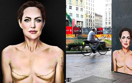 할리우드 영화배우 앤젤리나 졸리(47)의 유방 절제술 흉터가 그려진 벽화가 19일(현지시간) 이탈리아 밀라노 중심부인 산 바빌라 광장에 등장했다.