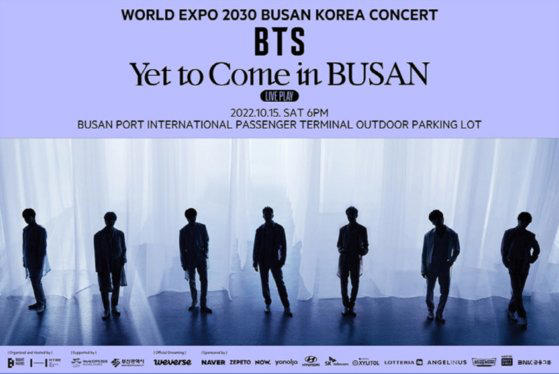 2030 부산세계박람회 유치 기원 콘서트 ‘옛 투 컴 인 부산’(Yet To Come in BUSAN)은 10월 15일 오후 6시 부산 아시아드 주경기장에서 개최된다. 온라인 라이브 스트리밍은 위버스, 제페토, 네이버 나우에서 볼 수 있다. TV는 국내 JTBC, 일본 TBS 채널(CHANNEL) 1을 통해 중계된다. 사진 포스터