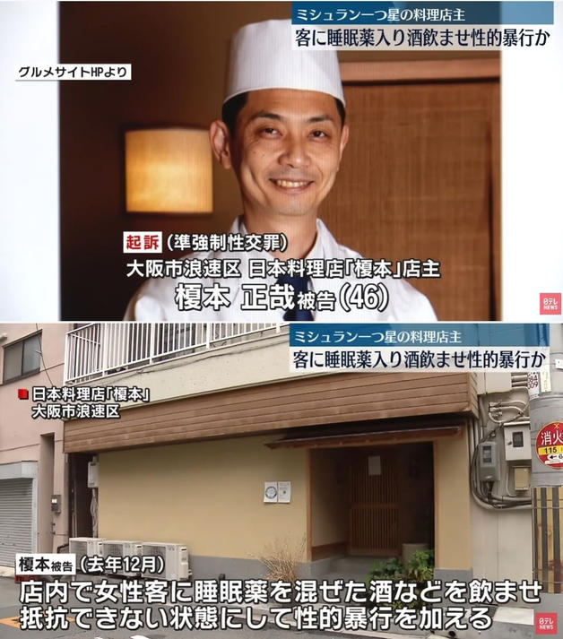 니혼테레비는 7일 오사카현 오사카시 나니와구에 있는 일식당 '에노모토'의 오너셰프(요리사) 에노모토 마사야(46)가 준강간 혐의를 받고 구속 기소됐다고 보도했다.