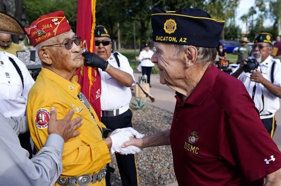 14일(현지시간) 미국 남서부 애리조나주(州) 피닉스에서 ‘나바호 암호 부대원의 날’ 기념식이 열려 제2차 세계대전 및 6·25전쟁에 참전한 노병들이 모처럼 회포를 풀었다. 나바호족은 북미 원주민의 일부로 오늘날 애리조나주 북동부, 뉴멕시코주 북서부, 유타주 남동부에 걸친 약 7만1000㎢ 면적의 보호구역에 살고 있다. 마치 독립국인 것처럼 대외적으로 ‘나바호 국가’(Navajo Nation)란 명칭을 쓴다.