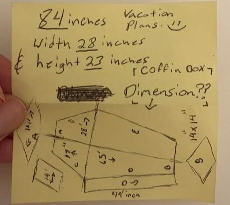 노란색 메모지에는 관으로 추정되는 도안이 그려져 있었고 "관 상자 치수??"라는 글이 적혀 있었다.