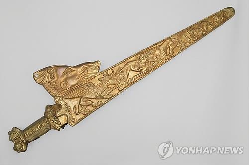 (서울=연합뉴스) 2011년 예술의전당 한가람미술관이 마련한 ‘스키타이 황금문명’ 전에 선보이는 우크라이나 지역 출토 스키타이 황금유물 중 황금칼집과 칼집과 칼자루 장식이 된 검. 기원전 4세기말. 길이 655㎜. 2011.11.30. [예술의 전당 제공. 재판매 및 DB금지]