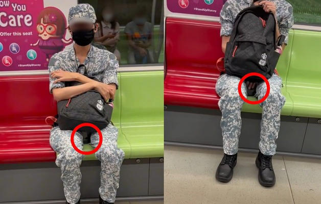그러면서 "경찰에 신고했고, 증거를 남기기 위해 영상으로 찍어뒀다"고 덧붙였다. 영상을 본 누리꾼들은 "딱 봐도 수상해보인다"면서 "가방을 품에 안고 있는 것도 군복에 있는 이름을 가리려는 의도가 아니냐"고 추측했다.