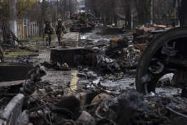 © AP연합뉴스 우크라이나 군인들이 3일(현지시간) 수도 키이우(키예프) 외곽 소도시 부차에서 파괴된 러시아 탱크의 잔해들 사이를 걸어가고 있다. AP연합뉴스