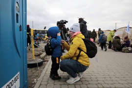 © news1 세계 여성의 날인 8일(현지시간) 우크라이나 접경 지역인 폴란드 메디카 국경검문소 인근 쉼터에서 한 피란민이 추위를 막기 위해 아이의 옷매무새를 다듬고 있다. 2022.3.9/뉴스1 © News1 조태형 기자