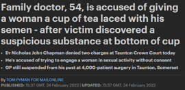 보도에 따르면 서머싯주의 한 건강센터에서 가정 주치의로 근무하는 니콜라스 존 채프먼(54) 박사는 지난해 9월 두 차례에 걸쳐 여성 환자에게 차를 건넸다.