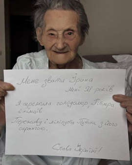 할머니는 “제 이름은 이리나입니다. 저는 98살입니다. 나는 홀로도모로, 히틀러, 그리고 독일인으로부터 살아남았습니다. 푸틴에게도 살아남을 것입니다. 우크라이나에 영광을”이라고 썼다.