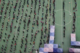 홍콩 거주민들이 야외 체육시설에 설치된 신종 코로나바이러스 감염증 임시 검사소에서 검사를 받기 위해 대기하고 있다. 홍콩=AP 연합뉴스
