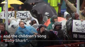 시위대는 아기상어 노래와 율동을 함께 하며 정부의 의무접종에 반대의사를 표하고 있다.