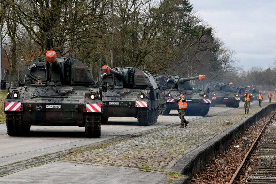 | 독일 니더작센주 문스터에서 14일(현지시간) 북대서양조약기구(NATO·나토) 회원국이자 러시아에 인접한 리투아니아로 이동하는 독일 연방군 소속 자주포들이 열차 수송을 기다리고 있다.로이터뉴스1 |