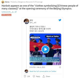 해당 글 작성자는 "올림픽 개막식 미쳤나 각계각층 '중국인들'이라며 한복이 왜 나오는데"라며 한복 등장 장면이 담긴 3초 영상을 게재한 한국인 트위터 게시글을 공유해 이같이 밝혔다.