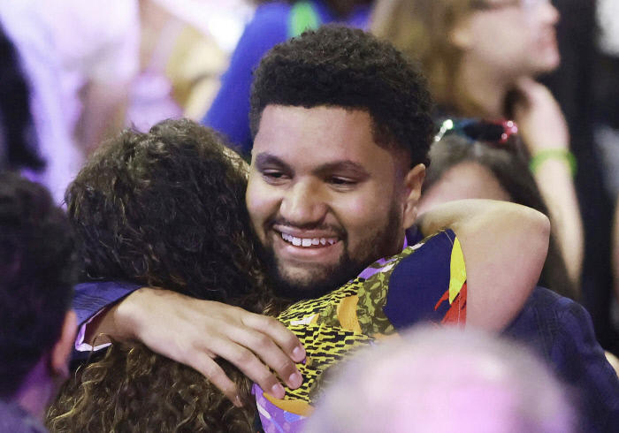미국 플로리다주 올랜도의 민주당 연방 하원의원 후보가 된 25세 우버 운전기사 맥스웰 프로스트가 지난달 23일(현지시간) 경선 후 지지자들에 감사를 표하고 있다. 올랜도 | AP연합뉴스  © AP연합뉴스