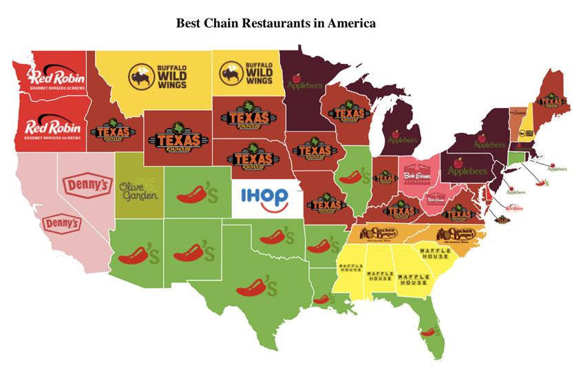 미국에서 가장 많이 찾는 캐주얼 다이닝 레스토랑은 텍사스 로드하우스로 12개 주에서 1위를 차지했다. 이어 칠리스 그릴 앤 바가 10개 주에서 1위를 차지했다.