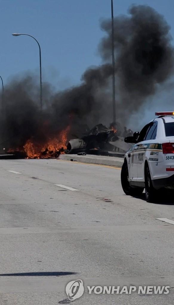 보도에 따르면 마이애미-데이드 경찰은 세스나172 기종 경비행기가 마이애미 부근의 홀오버 인렛 다리로 떨어져 스포츠유틸리티차(SUV)에 부딪힌 뒤 불길에 휩싸였다고 밝혔다.
