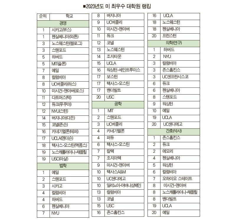 법학대학원인 로스쿨 순위는 지난해와 마찬가지로 예일대가 1위, 스탠포드 2위에 올랐고, 뒤이어 지난해 4위를 기록한 시카고대가 한 단계 상승하며 올해 3위에 올랐다. 뒤이어 컬럼비아와 하버드가 공동 4위, 펜실베니아대는 6위를 지켰고, NYU가 지난해보다 한 단계 내려간 7위를 차지했다.