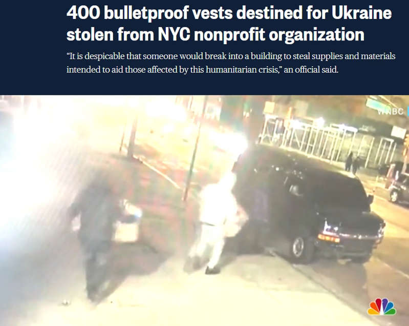 미국 뉴욕에서 우크라이나로 보내질 예정이었던 방탄조끼 약 400벌이 도난당하는 일이 벌어졌다.