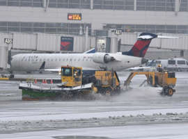 겨울 폭풍이 강타한 미국 미시간주 로물루스 '디트로이트 메트로폴리탄 웨인 카운티 공항'에서 2일 제설 차량이 여객기 주변 눈을 치우고 있다. 로물루스=AP 연합뉴스