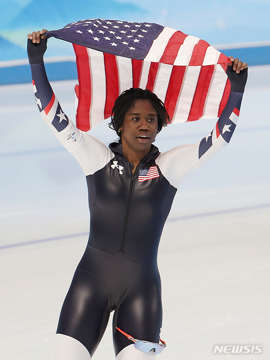 © 뉴시스 [베이징(중국)=뉴시스] 김병문 기자 = 13일 오후 중국 베이징 국립 스피드 스케이팅 오벌 경기장에서 열린 2022 베이징 동계올림픽 스피드 스케이팅 여자 500m 경기, 미국 에린 잭슨이 금메달 확정 뒤 미국 국기를 들고 트랙을… / 김희준 기자