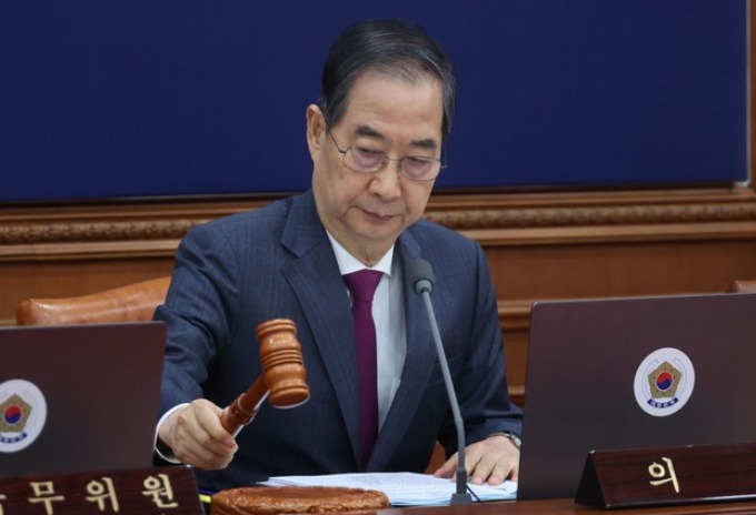 한덕수 대통령 권한대행이 14일 정부서울청사에서 열린 국무회의에서 의사봉을 두드리고 있다. 그는 미국발 통상 분쟁과 관련,
