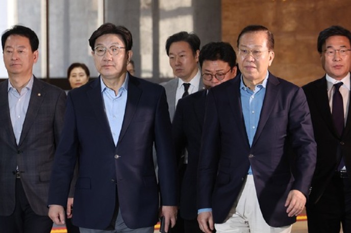 국민의힘 권영세 비상대책위원장과 권성동 원내대표가 6일 서울 여의도 국회에서 열린 의원총회에 참석하고 있다. [사진=연합뉴스]