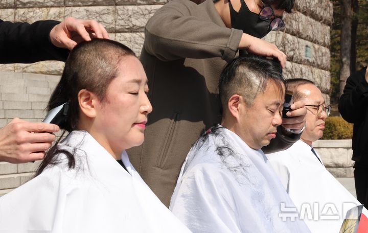 헌법재판소의 윤석열 대통령에 대한 조기 파면 결정을 촉구하며 삭발하고 있다. 2025.03.11. ⓒ 뉴시스
