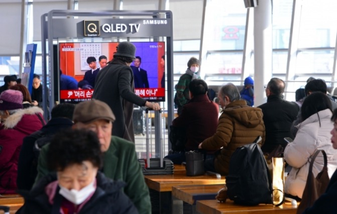 설 연휴를 하루 앞둔 지난 24일 광주송정역 대합실에서 귀경·귀성길에 오르려는 시민들이 뉴스를 시청하고 있다. 광주 뉴스1