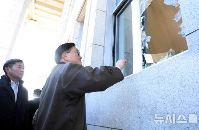 깨뜨린 국민의힘 정책위의장실 유리 창문을 바라보고 있다. 2024.12.04.