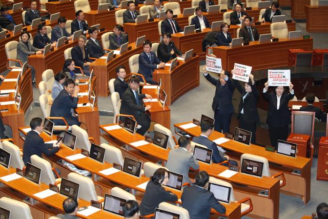 진보당 의원들이 윤석열 대통령 탄핵·김건희 여사 특검법 표결을 앞둔 7일 오후 서울 여의도 국회 본회의장에서